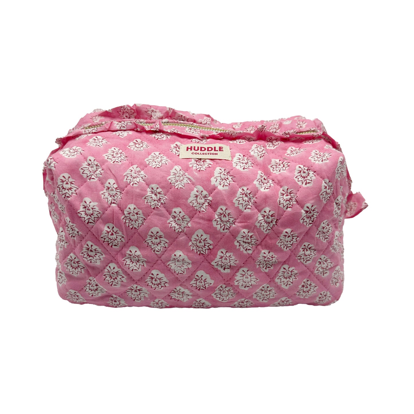 Frilled and quilted hand block printed cotton wash bag in a traditional Indian Floral design. White flowers on a pretty pink coloured background. Comes with a waterproof lining and decorative frilled trim.