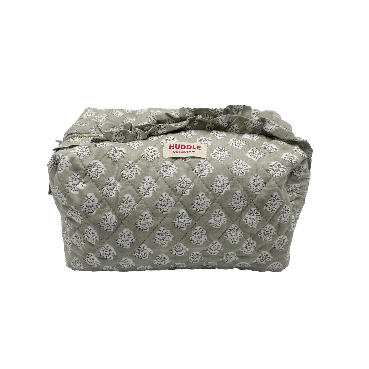 Frilled and quilted hand block printed cotton wash bag in a traditional Indian Floral design. White flowers on a lovely biscuit coloured background. Comes with a waterproof lining and decorative frilled trim.